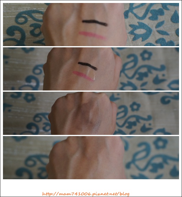 卸妝油質地是透明的。測試卸妝效果,於手背上畫口紅和防水眼線膠筆,都可以輕鬆的卸除。